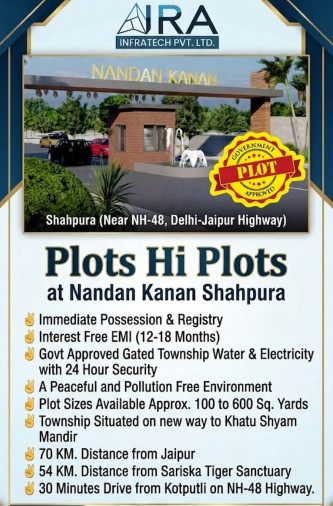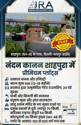 Nandan Kanan shahpura is a plotted development of 200 plots A ready to build plot with lifestyle amenities AT SHAHPURA.\r\n\r\nLOCATED 60 KM FROM JAIPUR\r\nKHATUSHYAM JI TEMPLE 60 KM ON OUR ROAD, NEW WAY.\r\nSARISKA WILDLIFE SANCTUARY 100 KM\r\nNEAR NEEMRANA INDUSTRIAL AREA\r\nCLOSE PROXIMITY ΤΟ ΝΗ-8\r\nSERENE & POLLUTION FREE ENVIRONMENT\r\nPLOT RANGE FROM 50 - 500 SQ. YARDS